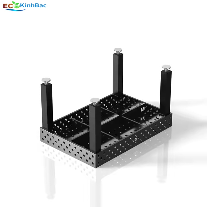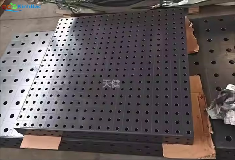 Đây có thể là bàn gá hàn 3D (3D welding table) bằng gang hoặc thép đúc — là loại bàn dùng trong gia công kim loại, đặc biệt phổ biến trong các xưởng hàn hoặc chế tạo cơ khí chính xác.