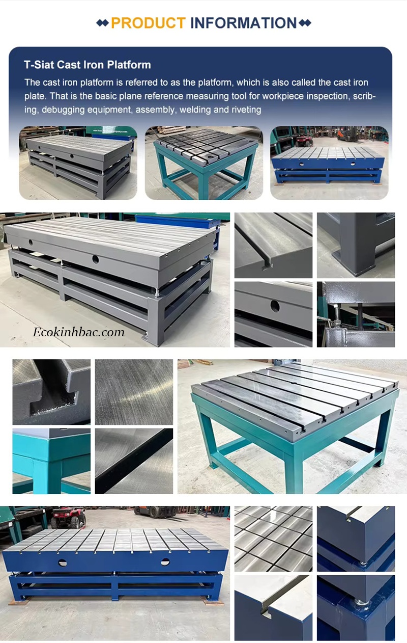 Rãnh T-slot: Bề mặt có các rãnh hoặc rãnh chữ T chuẩn, giúp kẹp hoặc gá chi tiết dễ dàng. Ví dụ: “Cast Iron Table with T Slot - perfect for welding and heavy-duty tasks”.