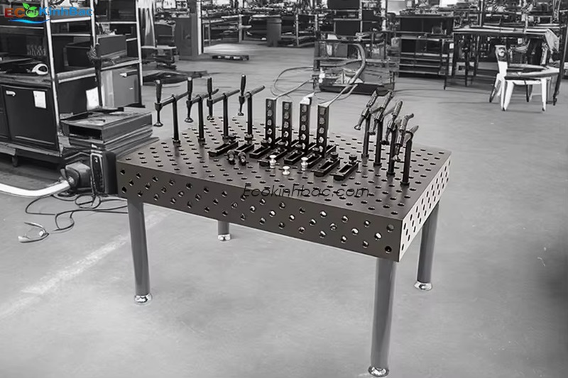 Đây có thể là bàn gá hàn 3D (3D welding table) bằng gang hoặc thép đúc — là loại bàn dùng trong gia công kim loại, đặc biệt phổ biến trong các xưởng hàn hoặc chế tạo cơ khí chính xác.
