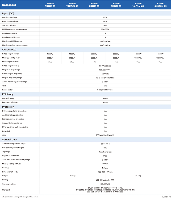 Thông số kỹ thuật của inveter hòa lưới SOFAR 8KTLM-G3 1 Pha