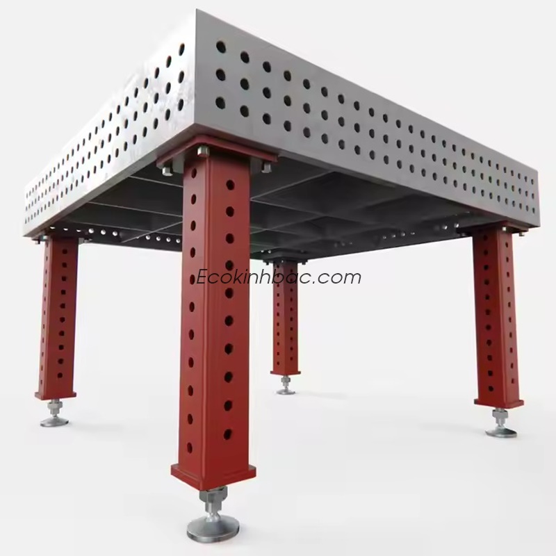 Đây có thể là bàn gá hàn 3D (3D welding table) bằng gang hoặc thép đúc — là loại bàn dùng trong gia công kim loại, đặc biệt phổ biến trong các xưởng hàn hoặc chế tạo cơ khí chính xác.