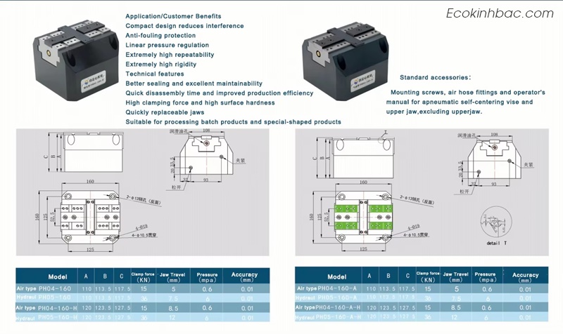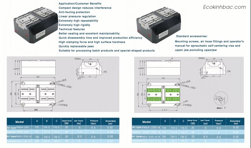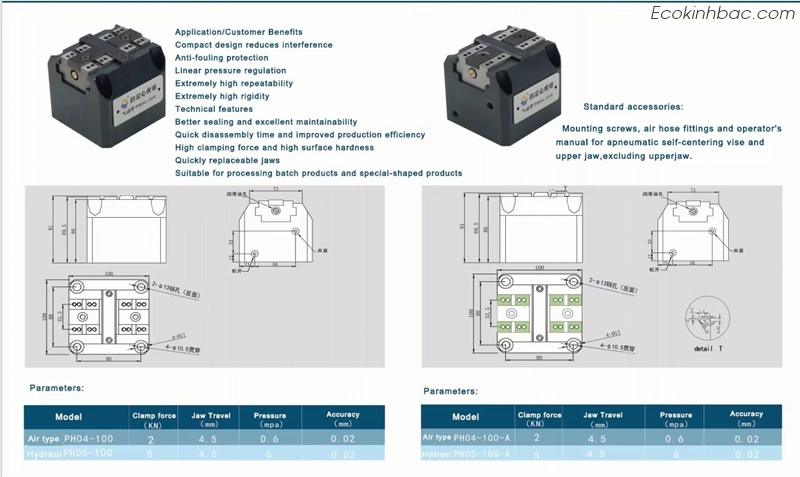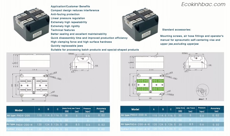 Ê tô khí nén model PH-04-200 là một thiết bị kẹp chặt chi tiết tự động, thường được sử dụng trên các máy phay CNC, trung tâm gia công và máy khoan. Thiết bị này giúp tăng hiệu quả sản xuất nhờ khả năng kẹp nhanh chóng và chính xác