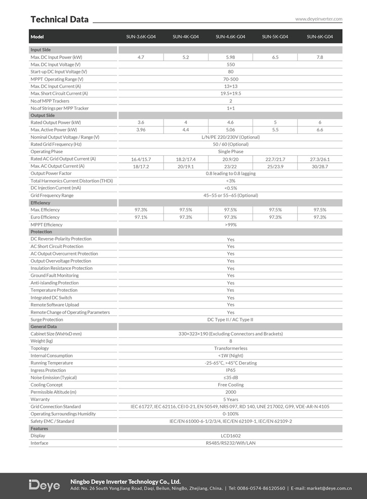 Thông tin thông số kỹ thuật biến tần Deye 6kW
