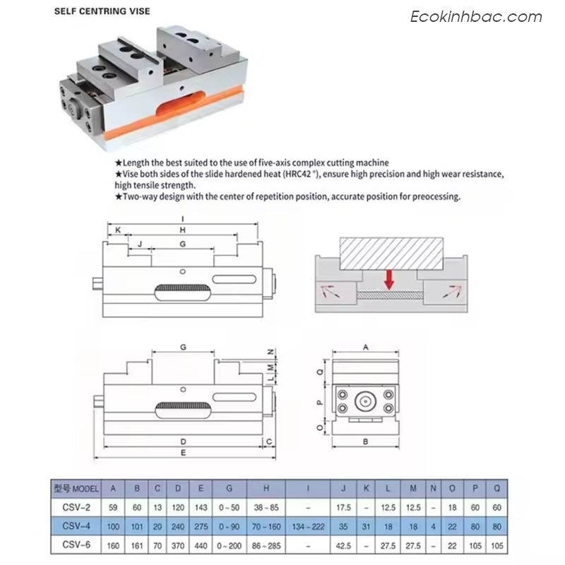 Kẹp giữ phôi định tâm CSV-4: là một loại ê tô tự định tâm, được thiết kế để cố định phôi một cách chính xác trên máy CNC. Loại kẹp này thường được sử dụng trong gia công phức hợp trên máy cắt năm trục, giúp đảm bảo độ chính xác cao và khả năng chịu mài mòn tốt. Hai mặt của kẹp được xử lý nhiệt và tôi cứng (HRC42°), giúp tăng độ bền và độ chính xác trong quá trình sử dụng