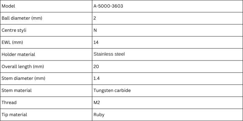 Kim đo A-5000-3603 Renishaw Đầu kim ruby M2 Ø2mm thân thép không gỉ, L 20 mm, EWL 14mm