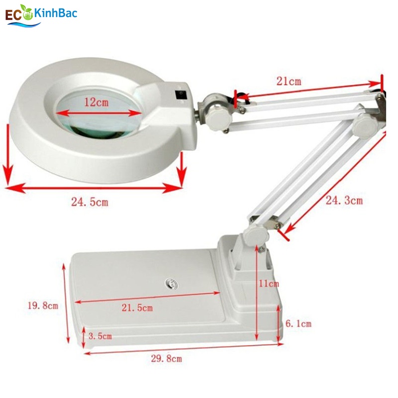 - Gọng kính gồm 3 khớp nối và đế xoay. Giúp linh hoạt trong quá trình sử dụng, có thể gập gọn, nâng hạ soi sát chân kính hoặc vươn xa ra các cạnh bàn