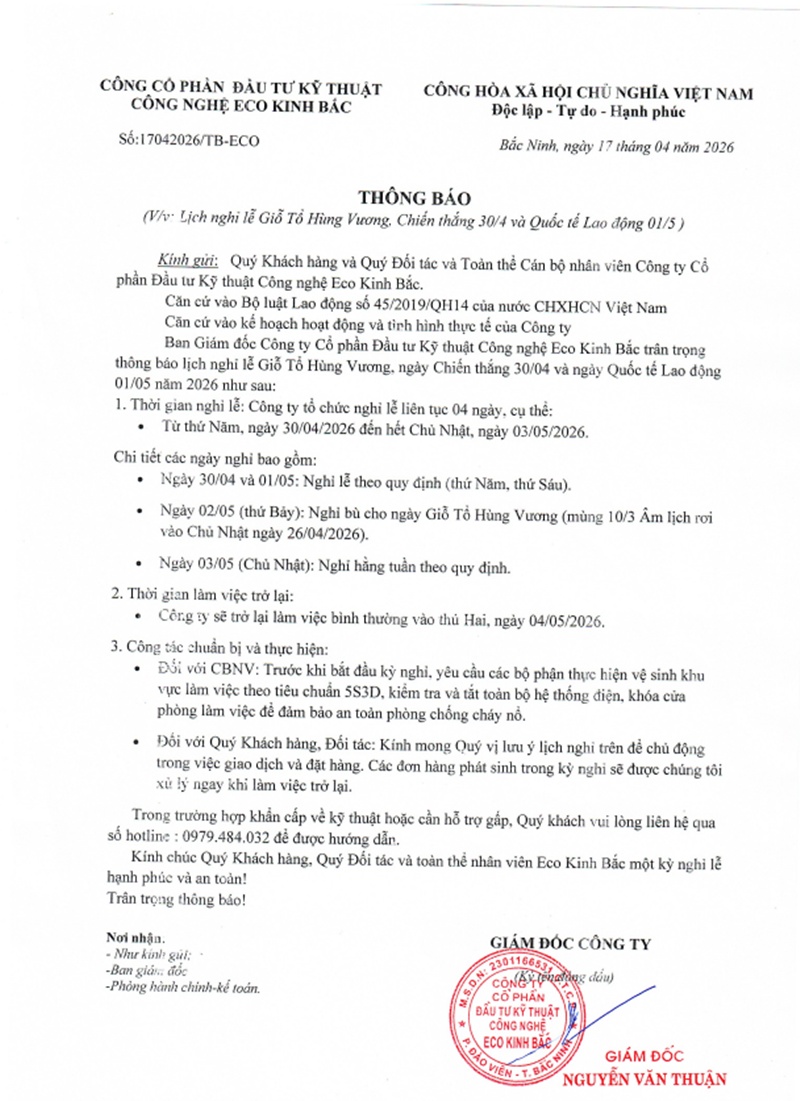 Ban Giám đốc Công ty Cổ phần Đầu tư Kỹ thuật Công nghệ Eco Kinh Bắc trân trọng thông báo lịch nghỉ lễ Giỗ Tổ Hùng Vương, ngày Chiến thắng 30/04 và ngày Quốc tế Lao động 01/05 năm 2026 như sau: