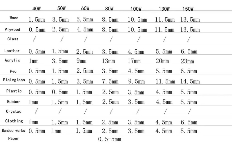 Độ sâu cắt sẽ khác nhau tùy theo công suất laser và loại vật liệu. Vui lòng chọn sản phẩm phù hợp với nhu cầu của bạn.